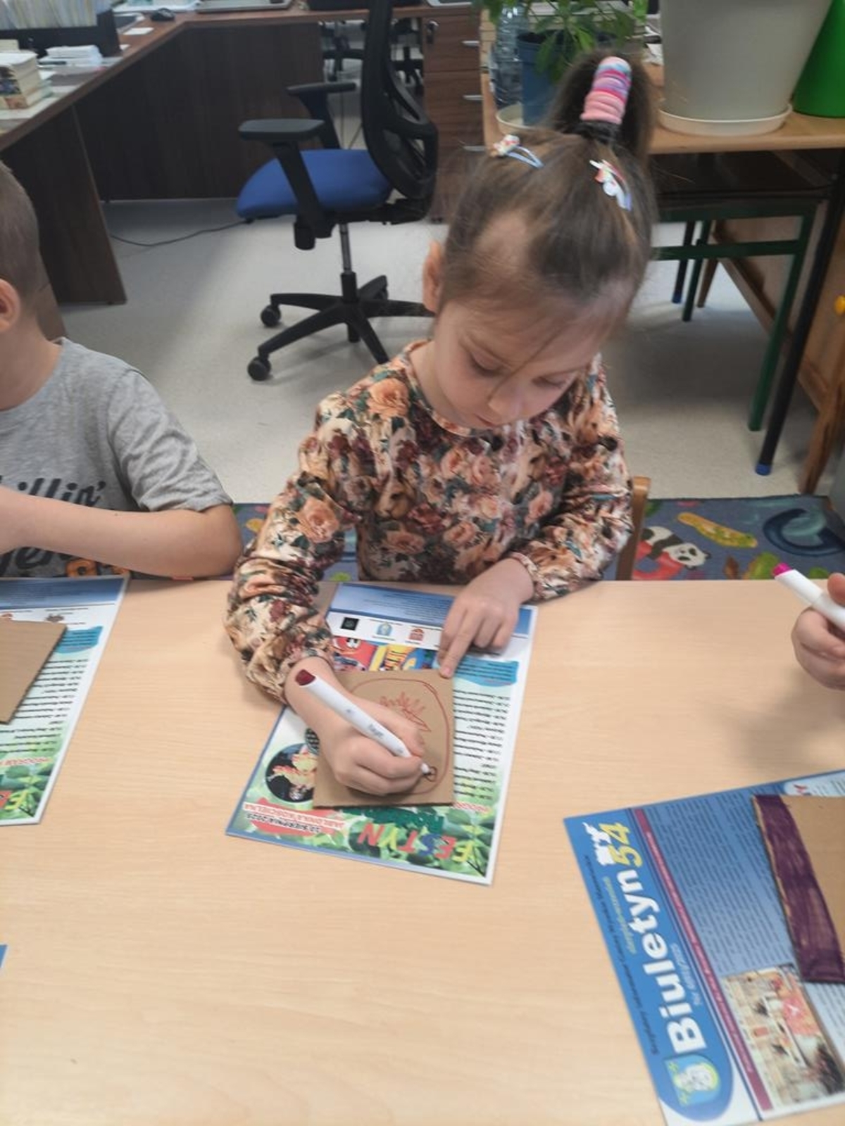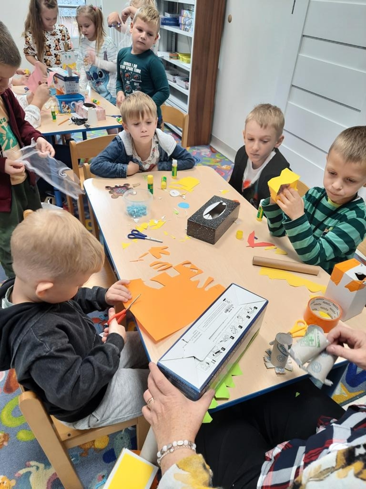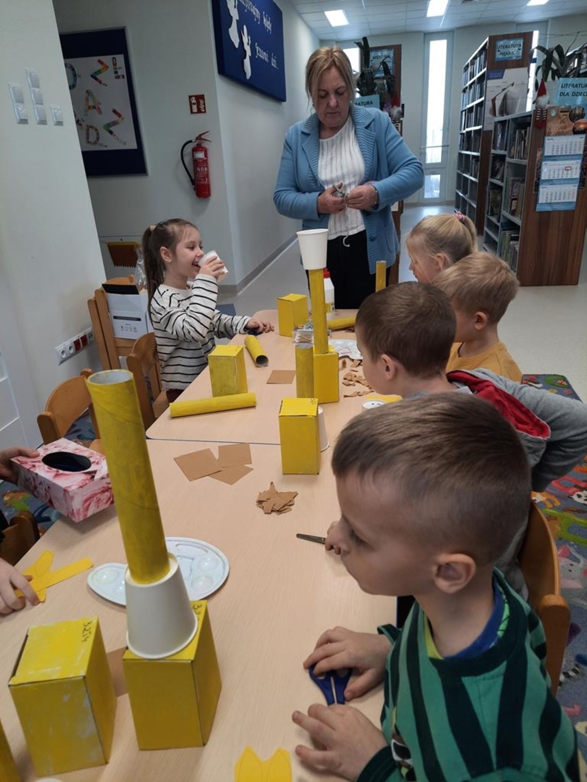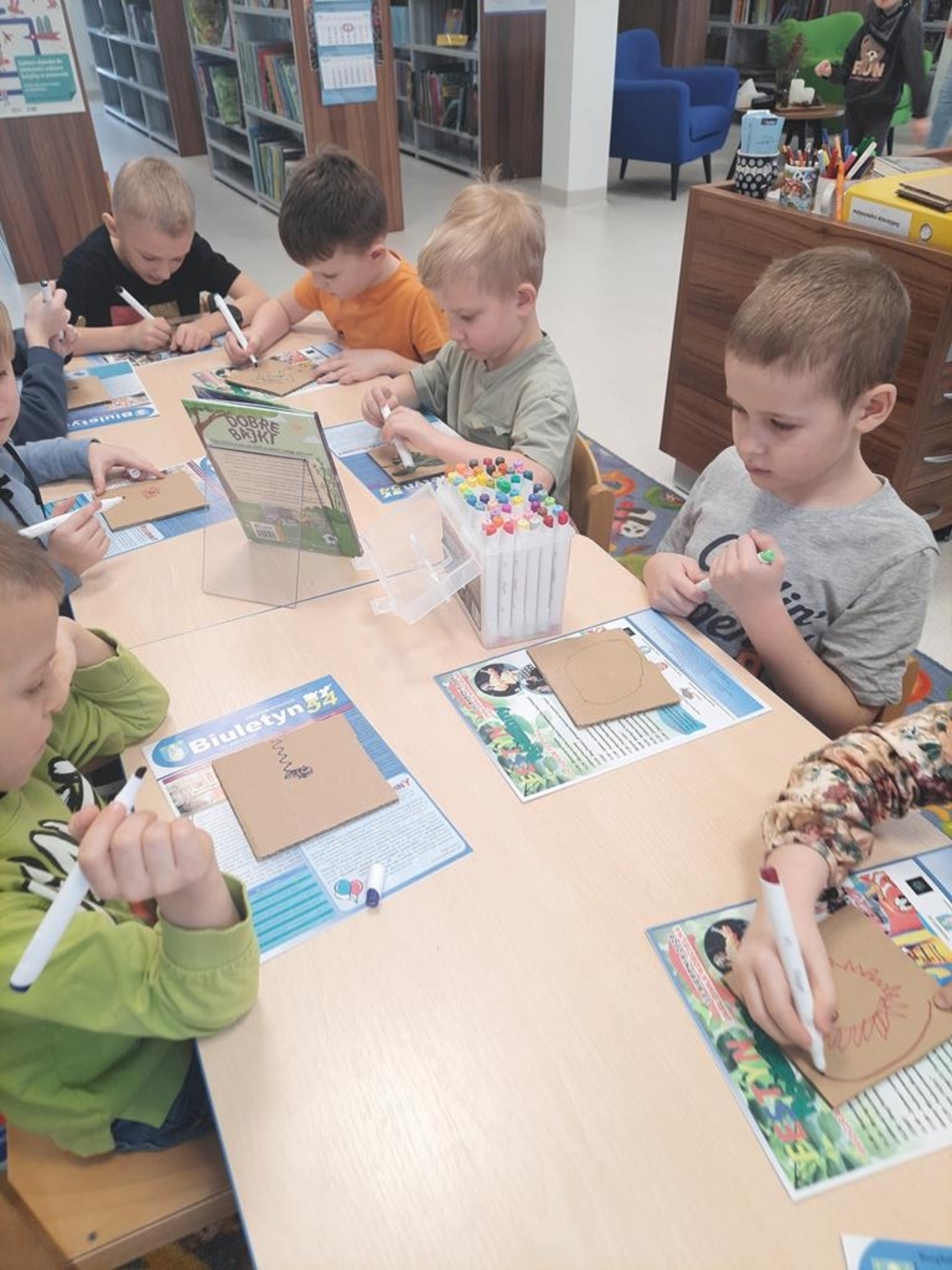 Grupa dzieci sześcioletnich w bieżącym roku szkolnym systematycznie , raz w tygodniu , uczestniczy w zajęciach literacko- plastycznych organizowanych przez Gminną Bibliotekę Publiczną w Jabłonce Kościelnej. Podczas spotkań, w oparciu o wybrane teksty literatury dziecięcej, wykonywane są prace plastyczne. Jest to idealna okazja, by rozwijać wyobraźnię i kreatywność manualną przyszłych uczniów. Tworzenie często przestrzennych prac ,uczy zaangażowania, cierpliwości i współdziałania. Wykonane prace dostarczają dużo satysfakcji i budują poczucie własnej wartości . Zależy nam na tym ,żeby biblioteka była miejscem , w którym miło i atrakcyjnie można spędzić czas.