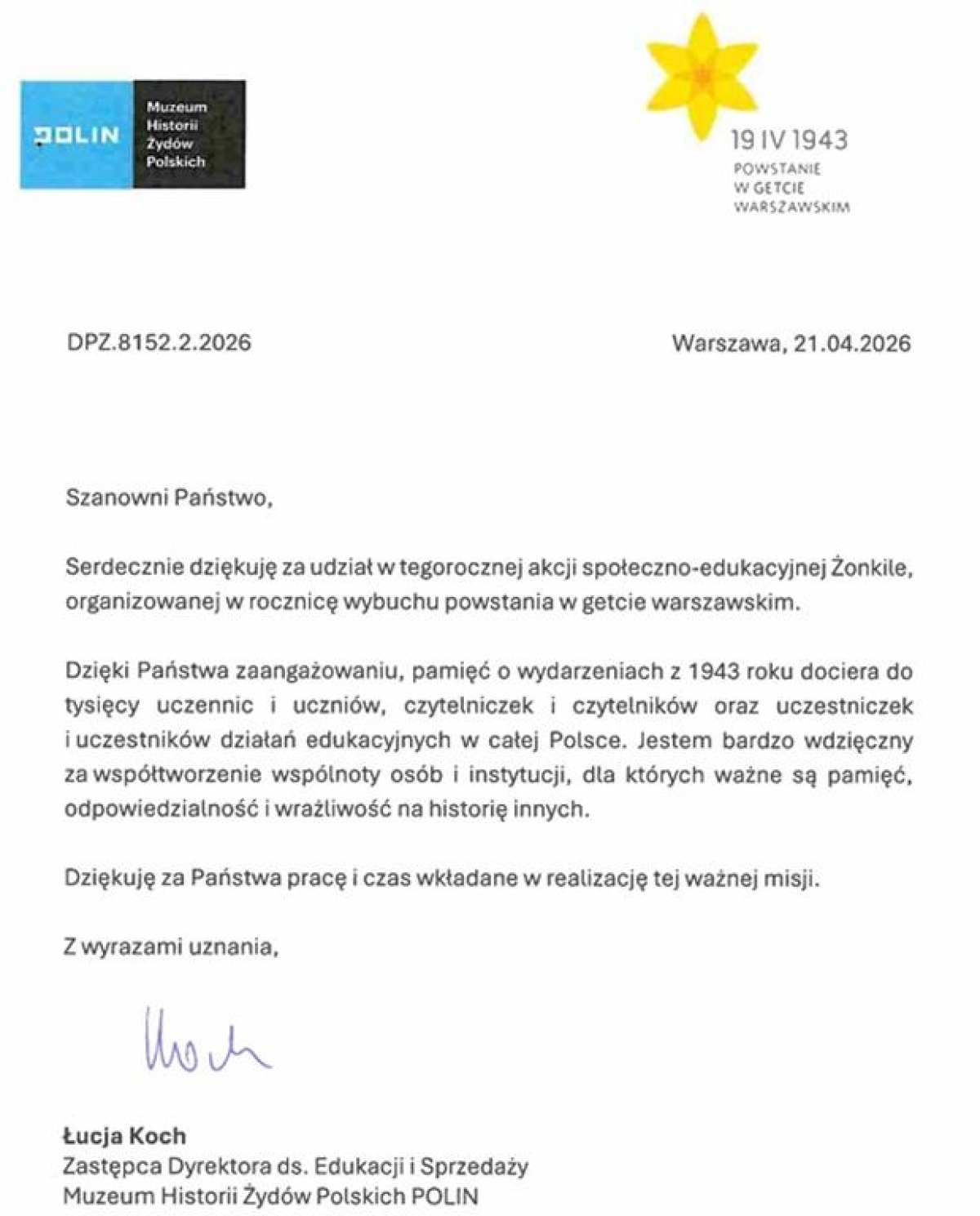 W dniu 20 kwietnia uczniowie i pracownicy Szkoły Podstawowej w Jabłonce Kościelnej , przypinając żółte żonkile upamiętnili bohaterskie czyny, jak również odwagę walczących o życie i wolność mieszkańców Warszawskiego Getta.
