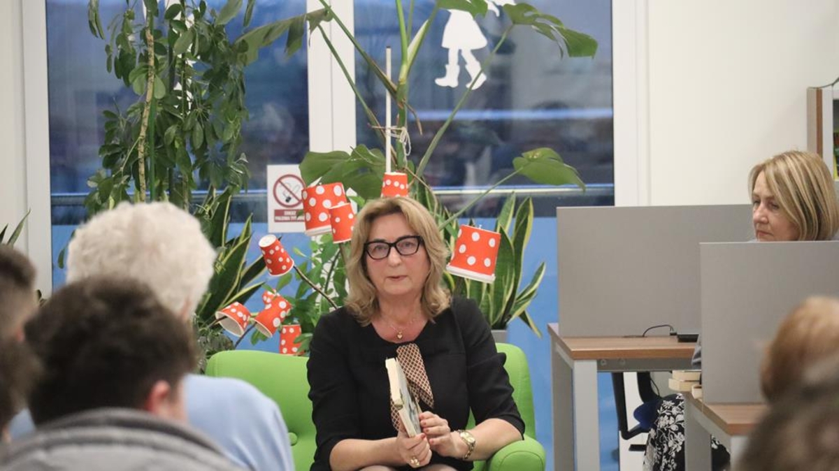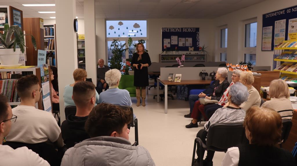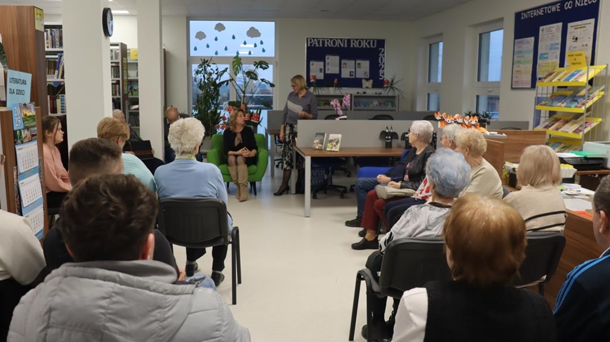 Poniedziałkowe spotkanie w bibliotece dotyczyło jednak powieści napisanych przez naszego gościa. Autorka opowiadała o kulisach powstawania poszczególnych książek : Powierniczka tajemnic(2020), Sawantka(2021), Kaszmirowa chusta(2022), Złodziejki żon(2023), Dziedziczka z lipowej alei (2024), Panie ze Stokowego Dworu( 2025), Pela z białego miasta –(premiera 21 listopada 2025). Po prezentacji i przeczytaniu fragmentów powieści, nastąpiła dyskusja z publicznością na temat zawartych treści historycznych oraz uchwycenia zwyczajów i tradycji , które zmieniły się z upływem lat.