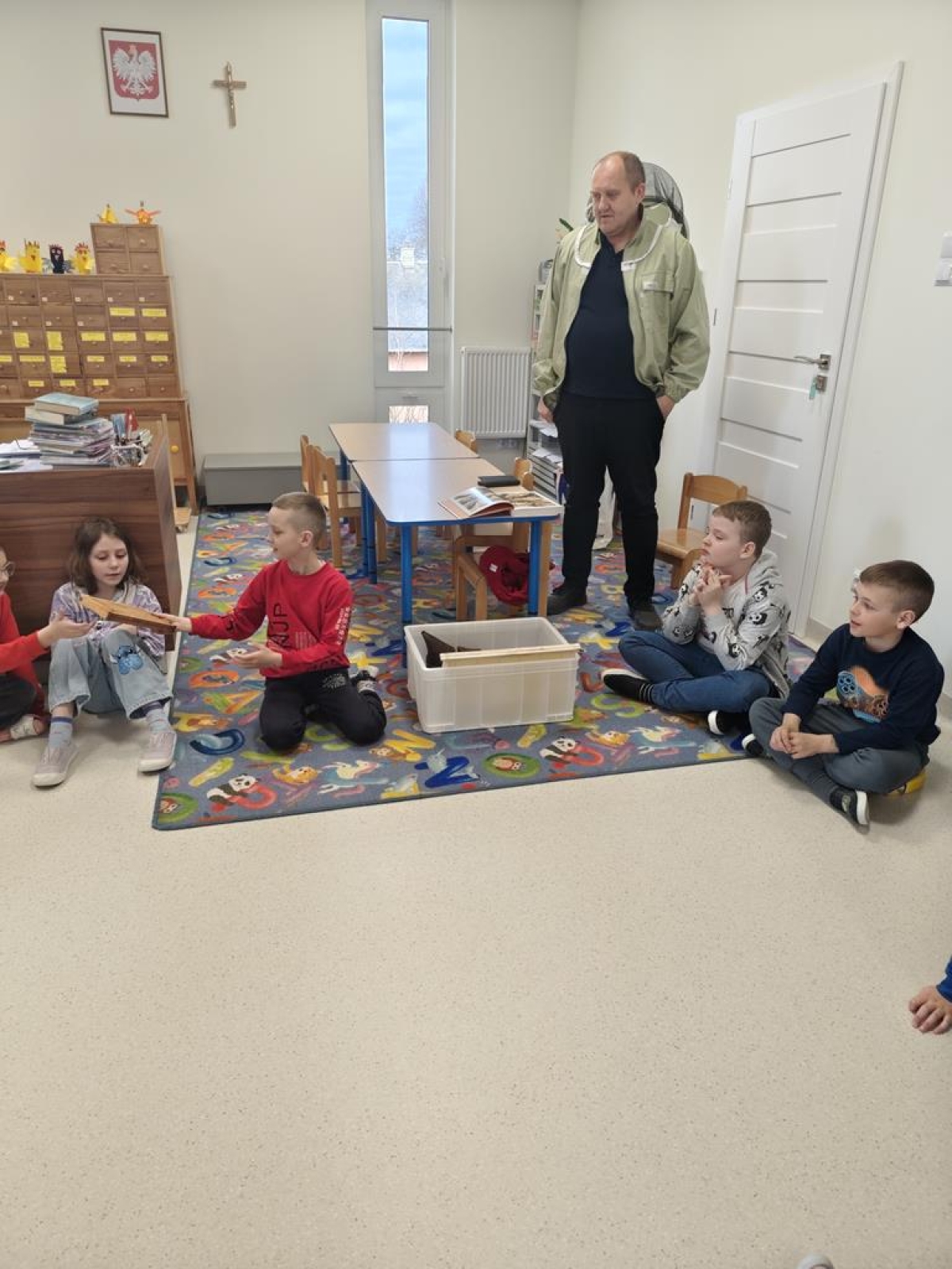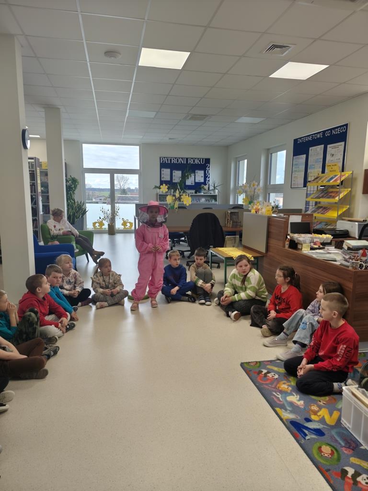W dniu 10 kwietnia zajęcia odbywały się w nieco inny sposób. Na spotkanie w bibliotece zaprosiliśmy Pana Tomasza Chilkiewicza , który jest pasjonatem pszczelarstwa. Podczas wizyty zaproszony gość opowiadał nam o życiu pszczół, ich zwyczajach oraz o tym jak buduje się pasiekę i w jaki sposób pozyskuje się miód. Podczas prelekcji dzieci zobaczyły prawdziwy strój pszczelarza i przedmioty ,których używa w pracy. Do zilustrowania tematyki poruszanej na zajęciach wykorzystano książki znajdujące się w naszej bibliotece i przyniesione przez naszego gościa.