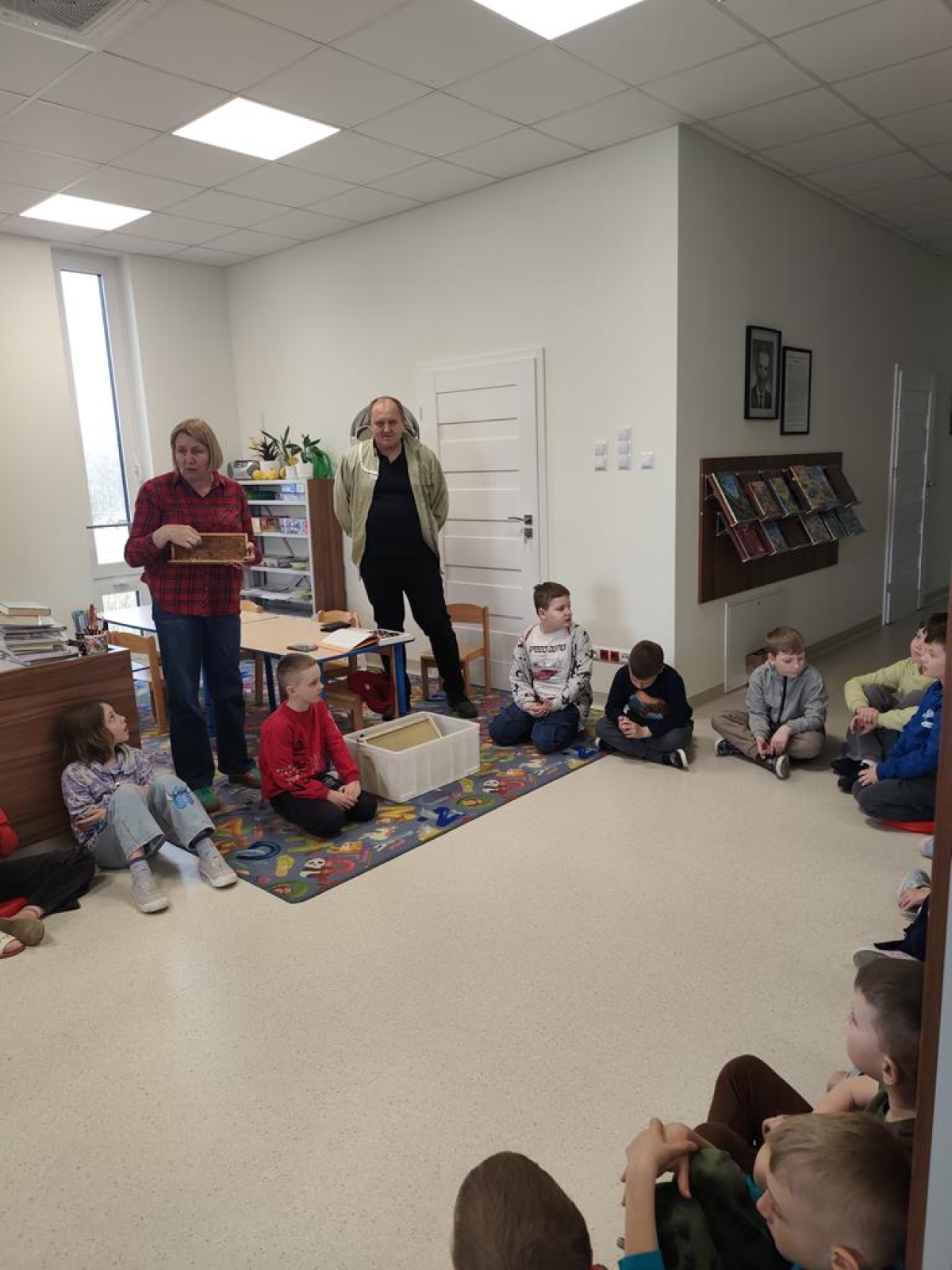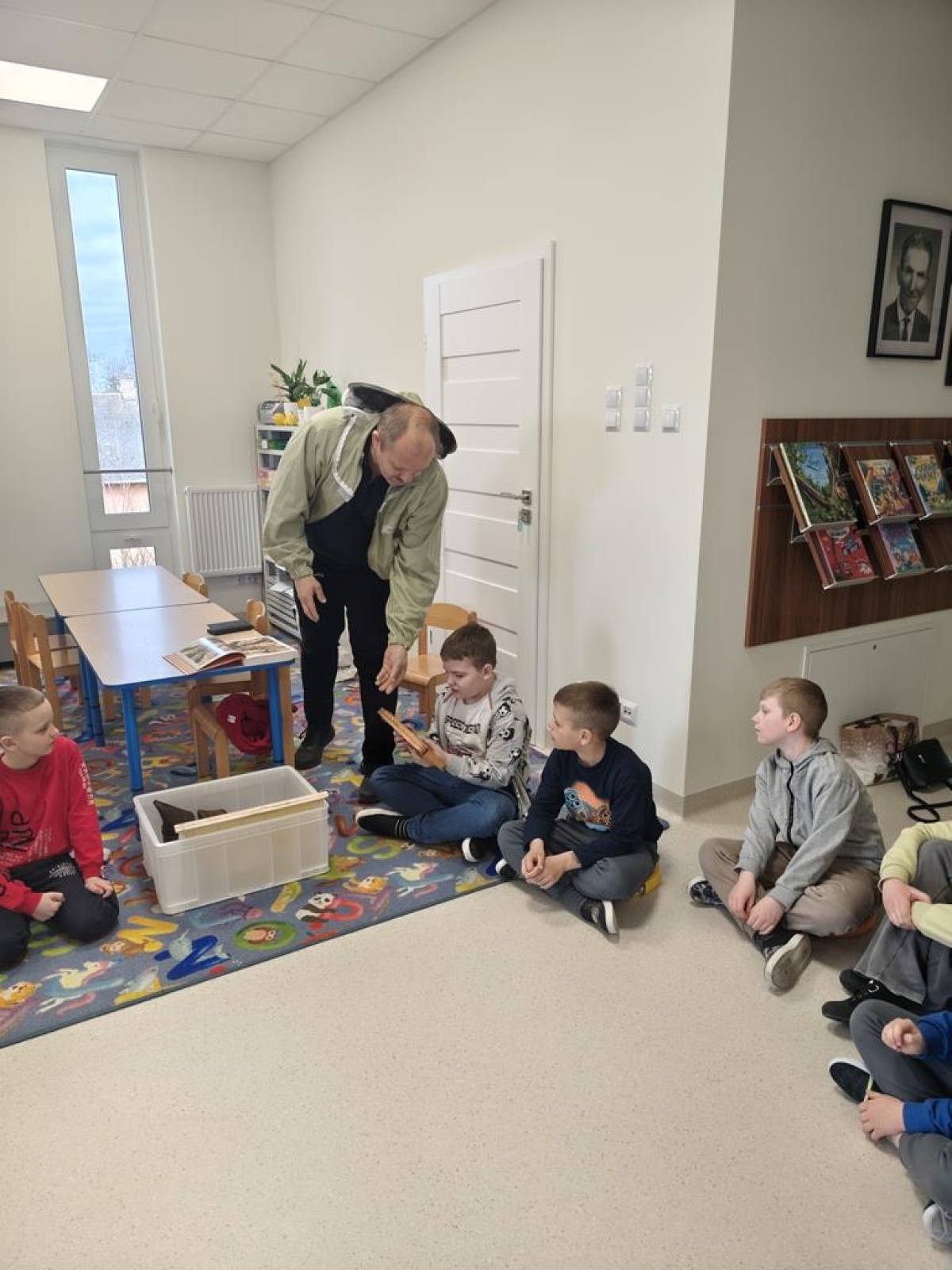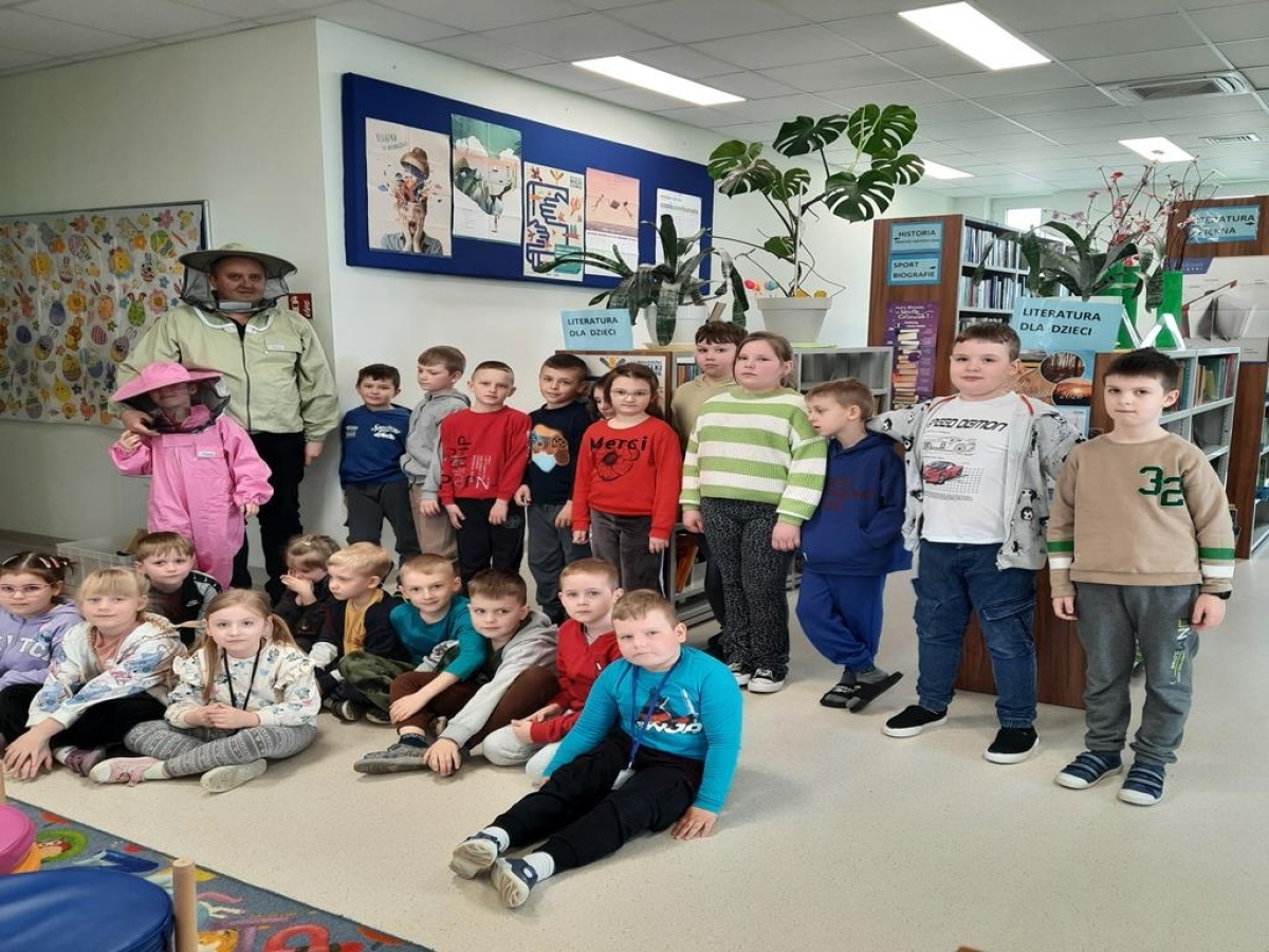 W dniu 10 kwietnia zajęcia odbywały się w nieco inny sposób. Na spotkanie w bibliotece zaprosiliśmy Pana Tomasza Chilkiewicza , który jest pasjonatem pszczelarstwa. Podczas wizyty zaproszony gość opowiadał nam o życiu pszczół, ich zwyczajach oraz o tym jak buduje się pasiekę i w jaki sposób pozyskuje się miód. Podczas prelekcji dzieci zobaczyły prawdziwy strój pszczelarza i przedmioty ,których używa w pracy. Do zilustrowania tematyki poruszanej na zajęciach wykorzystano książki znajdujące się w naszej bibliotece i przyniesione przez naszego gościa.